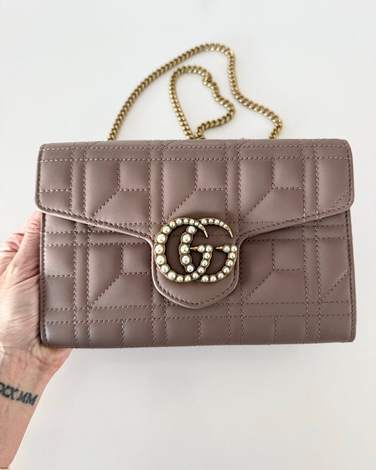 Gucci Limited Edition Dusty Rose and Pearl Logo Mini Marmont Chain Wallet