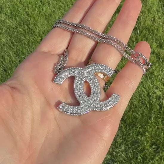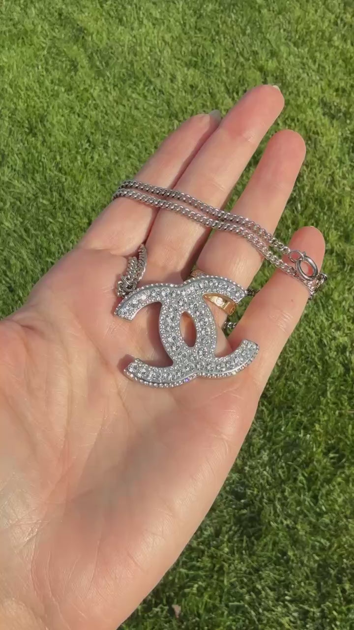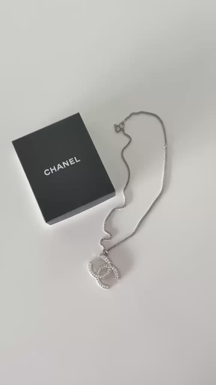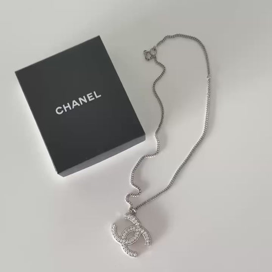 Chanel Silvertone Crystal Large CC Pendant Necklace
