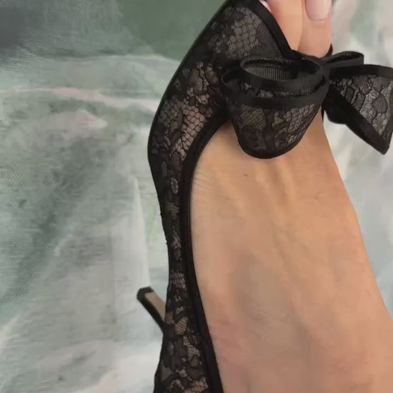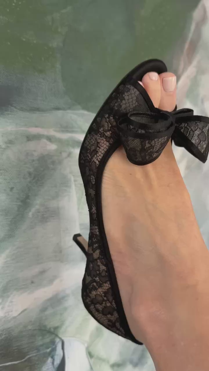 Valentino Black Lace Bow Peep Toe Kitten Heels Size 6.5/37